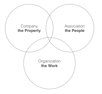 The Association is the group of people working in the company. They don't necessarily have a share, they're just bound by contract to do the work needed to attain the company's desired outcomes (at worst), or fulfill its purpose (at best). Simply put, the Association circle represents :